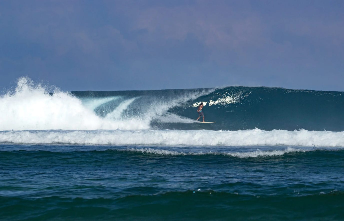 I order some pancakes for Arief and walk towards the beach. The sight that greets me is straight out of a magazine; it’s the most perfect scene imaginable. The swell has dropped quite substantially since the last time I was here. There are no more closeout sets; it’s just one perfect 4ft peeler after another. The waves are hugging the reef and running along beautifully for hundreds of metres. Perfect, flawless. The first part of the wave makes a quick barrel section right at the take-off and then it forms a steep wall that goes on forever. There are only five people in the water, and a few more on shore looking like they’re getting ready to go out too. I can’t believe my luck, it’s a perfect wave, and there’s only a handful of people out. It doesn’t get much better than this.